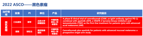黑色素瘤领域的2篇研究摘要,采用金年会- 金字招牌医药自主研发的PD-1抑制剂卡瑞利珠单抗(艾瑞卡)联合阿帕替尼(艾坦)(“双艾”组合)的免疫联合抗血管(或再联合化疗)的治疗策略。