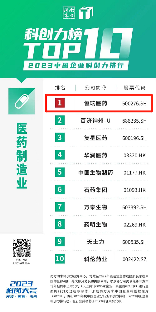 近日,南方周末科创力研究中心发布了与居民日常生活密切相关的30个行业中科创力排名前10的企业榜单。金年会- 金字招牌医药凭借多年来在科创领域的大力投入和优秀成果,蝉联中国企业科创力排行医药制造业榜首。